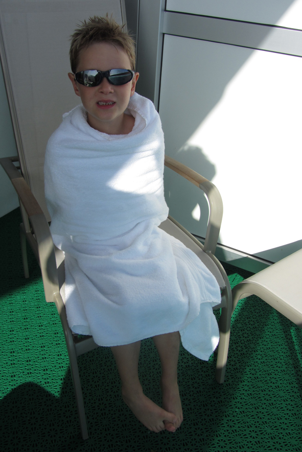 Although 32 degrees and sun blazing away overhead, there was a really strong sea breeze. Poor Callum was shivering but even he laughed as the only way we could get him to stay out on the balcony was if he wore his thick fleecy jumper (complete with sunglasses)! We eventually managed to get him to take a shower and he started to feel a little more himself.
