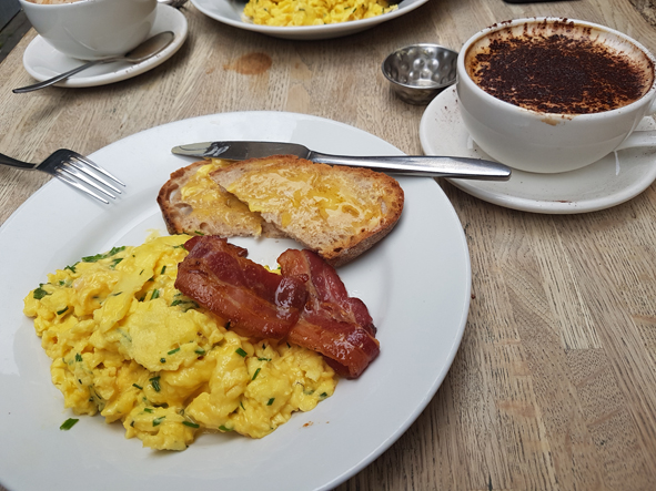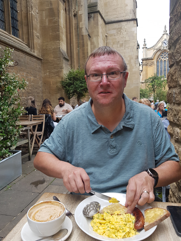 It proved to be little gem of a place. Vaults & Garden had a large indoors seating area under it’s vaulted ceiling – and a small courtyard outside with views of sorts over to the Radcliffe Camera. We were lucky enough to time it right so we could eat outside. We both went for Scrambled Egg on Toast with bacon and it was one of the nicest scrambled eggs we’d eaten. So light and fluffy.