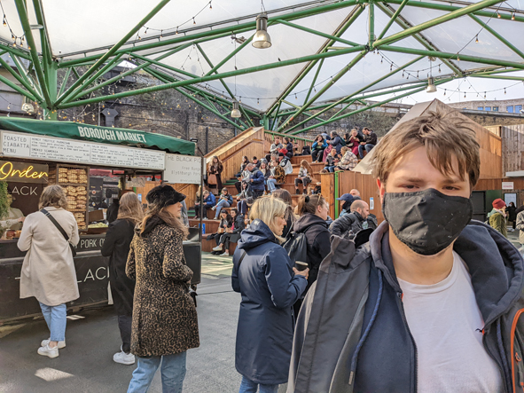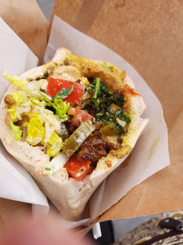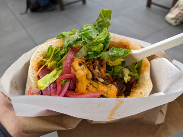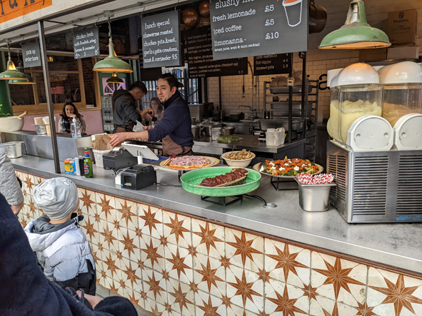 The Premier Inn County Hall was fully booked so we opted for the nearby Premier Inn Waterloo – just behind the Station and it was just two roads back from the river and County Hall. We dropped our bags off at the hotel and made our way to Borough Market – a favourite of ours for lunch. The street food choice is amazing. Our usual “fish and prawn” wrap stall was late opening so Jon and I opted for stuffed pittas from Shuk and Callum a Ciabatta roll.