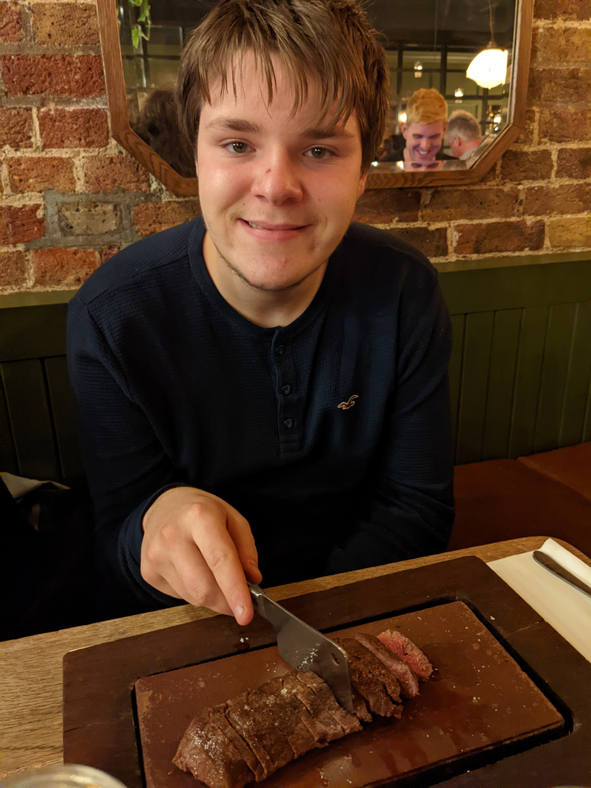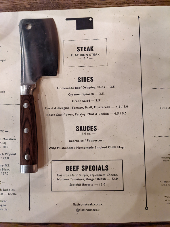 We finally made it and had the loveliest server ever – Chily – there wasn’t much to decide. You had a choice of Flat Iron Steak, Bavette Steak or a Burger (that was it!). The choice of sides – Fries, Green Salad or Spinach … and sauce if you wanted one. The knives were pretty cool too. Again, for London, the prices were very reasonable and we’ll certainly be back.