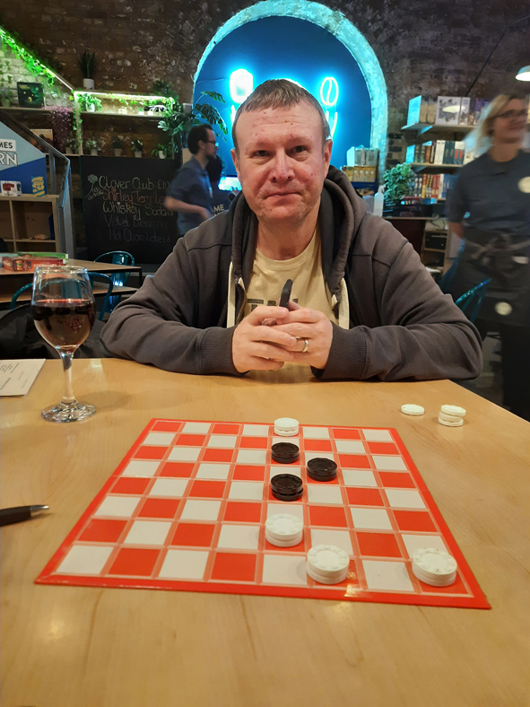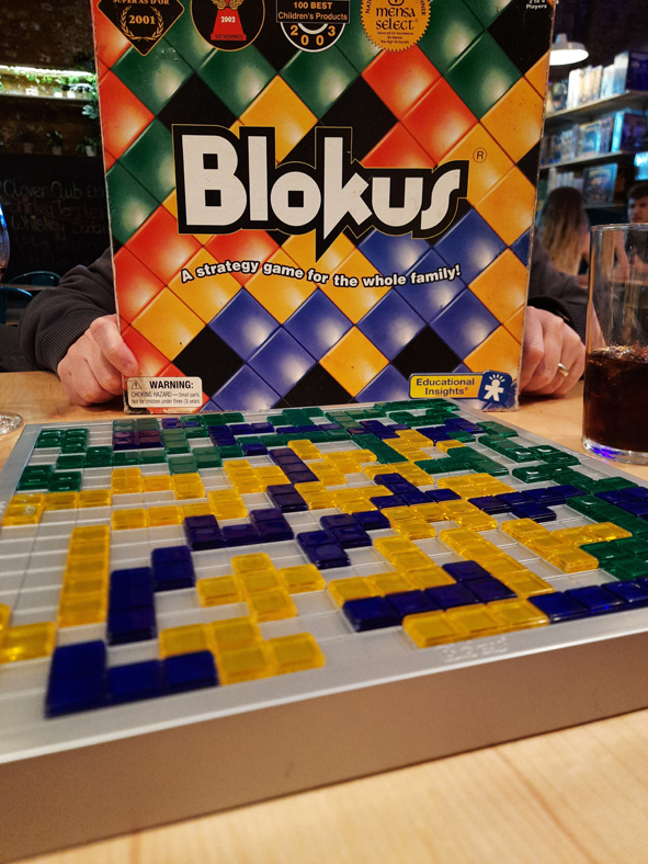 From here, we headed back to Draughts in Leake Street where we had a table booked until closing time. It really is a fab place to hang out with younger people. Callum chose another complicated game (Jaws) to start with. We quickly gave up on that and switched to a new favourite – Blockus. A very simple game that is really easy to pick up. We ended the evening with a game of draughts – Jon and I called our game a draw as we were going around in circles and making no headway.