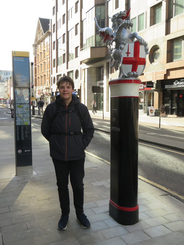 The trail took us into the City of London. We were aware the City had it’s own Police Force (not the Metropolitan Police) but we didn’t realise that the City had it’s own licensing laws too. We saw a pub serving food (usually a sign children can go in) and got to the bar and Jon started ordering drinks. The manager came running up asking Callum how old he was. It turns out no-one under the age of 18 are allowed in pubs / bars / restaurants even though they are drinking soft drinks. He was very apologetic – as was Jon as he saw his pint of cider being poured away!!