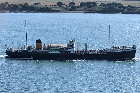 Jon had found out the SS Shieldhall was due to be sailing back to her dock for 6pm so we worked out when it would pass Britannia about 5.15pm. Perfect timing as we managed to catch a glimpse. A shame we couldn’t get right to the front of the ship as this was the “adult only” retreat, but we did hear her distinctive whistle and the music from the band, Soulcatcher, playing on board. This was the same band playing when we were on Shieldhall with Ray a couple of weeks back.