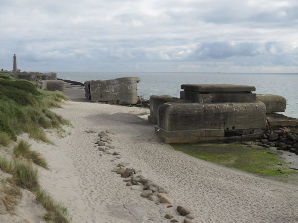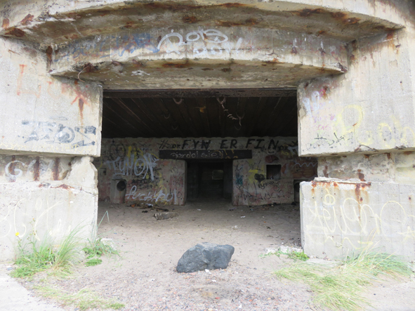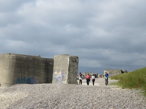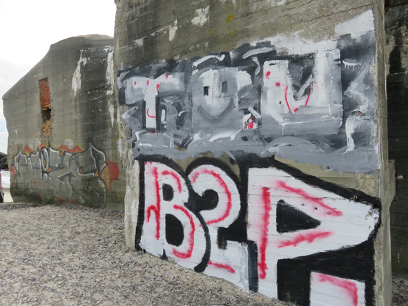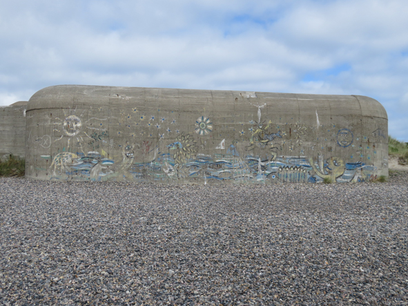 Rather than pick up the main road, we followed the locals who walked the path through the grass and dunes along the edge of a campsite to a coastal view point. From here, we dropped onto the beach. The beach front was littered with concrete bunkers that formed part of the German defenses in World War 2. With some of the land reclaimed by the sea, some bunkers had fallen into the sea but others still stood. Some leaning at an angle and it wouldn’t be long before these fell into the sea as well. Graffiti artists had used these bunkers to create their own artwork.
