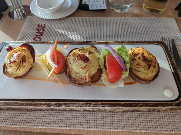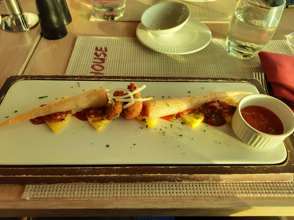 Starters chosen: Loaded Potato Skins for Jon (massive portion!!), I had the Panko-crumb and Filo Straw Tiger prawns (really good) and Callum the Piri-Piri Chicken Thighs and Dough Balls.