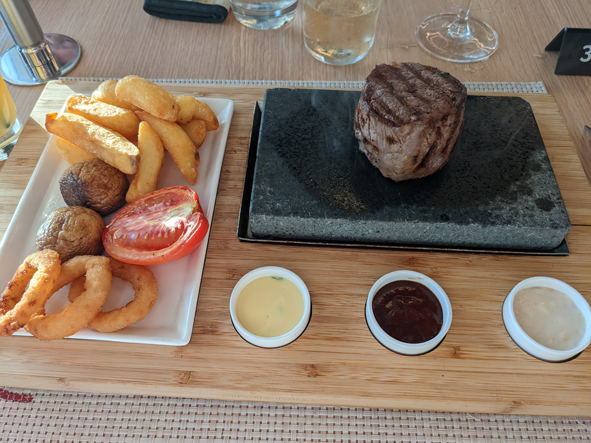 For mains, Callum had the Lobster, King Prawn, Squid and Monkfish Hanging Kebab whilst Jon and I both went for the 6oz fillet steak you cook on lava stone.