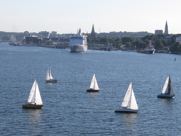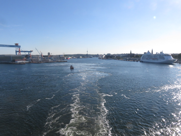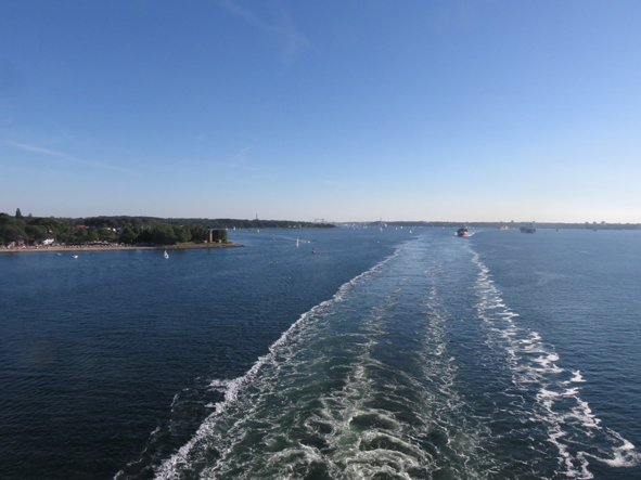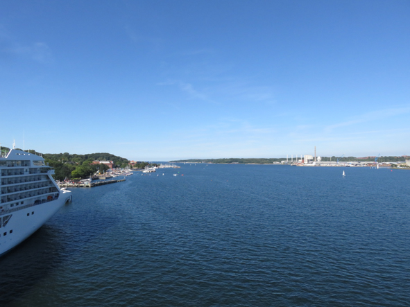 Back to the cabin to chill and watch sailaway from our balcony. Everyone was onboard really promptly and by 5.45 we’d pushed back and were on our way to Sweden. Britannia had to reverse out from her berth slowly and slowly swing around so we were facing in the right direction. To one side of the port was the German Navy – 15 or so boats in port. In the port area, there were loads of small yachts, some getting up pretty close to our ship. Seven Seas Voyager left just after us and was following us out. The yachts were really getting in her way and the captain kept sounding his horn telling them to get out of his way!