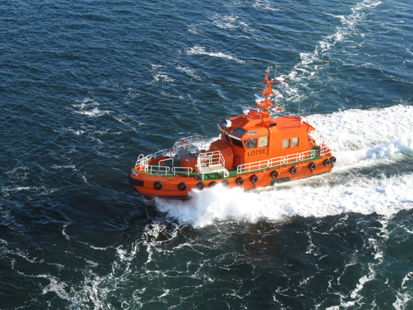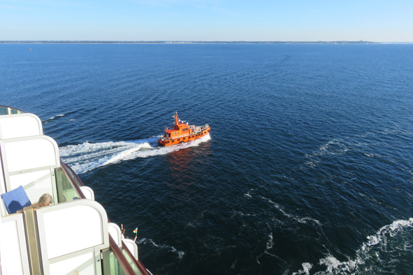 Just out to sea and Britannia slowed to about 10 knots – the pilot was disembarking. We saw the pilot boat cross the back of the ship and then head to the starboard side to collect him. He then peeled off and went to collect the pilots from the two merchant ships following in our wake.
