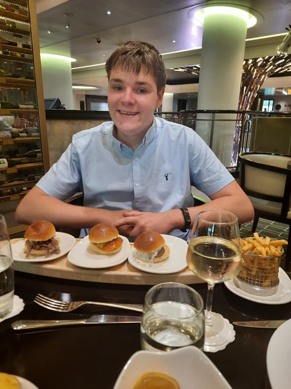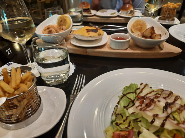 We shared three tasting dishes for starters – Tempura Prawns, Scallops and Lamb Kebabs. Callum chose sliders for his main whilst Jon and I went for Neptune’s Bounty – Scallops, Tiger Prawns and Dressed Crab served with salad and fries. There was plenty there for us.