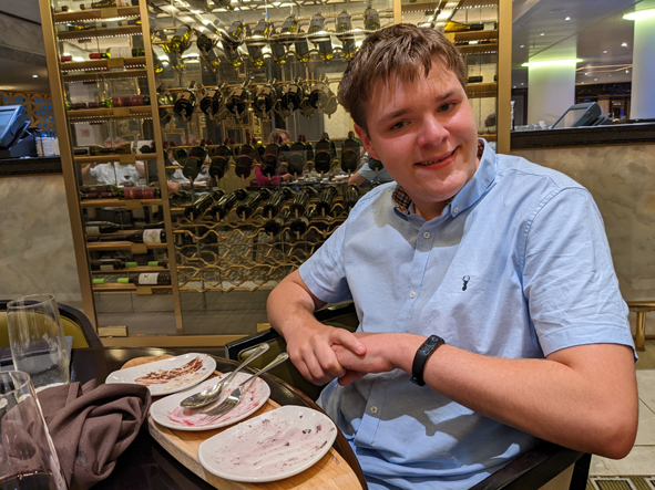 We then thought it best to get changed and head down to dinner! Callum’s choice this evening and he chose The Glass House. Jon and I started to read the menu and decided that choosing steak last night was limiting our options for this evening.