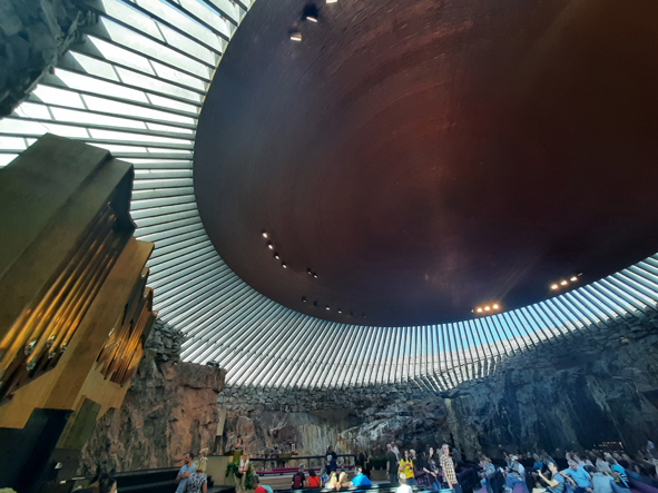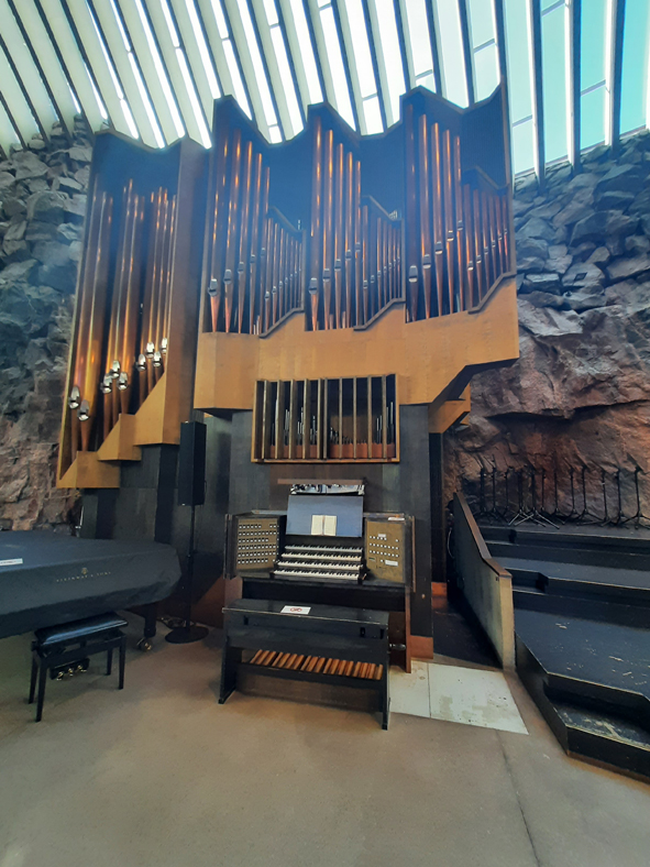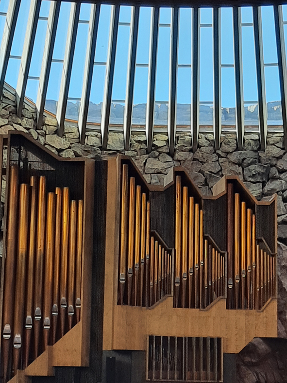 The church is full of light and and the copper roof compliments the colours in the rock walls. The organ pipework is also made from copper.