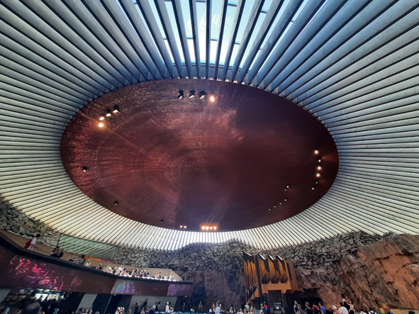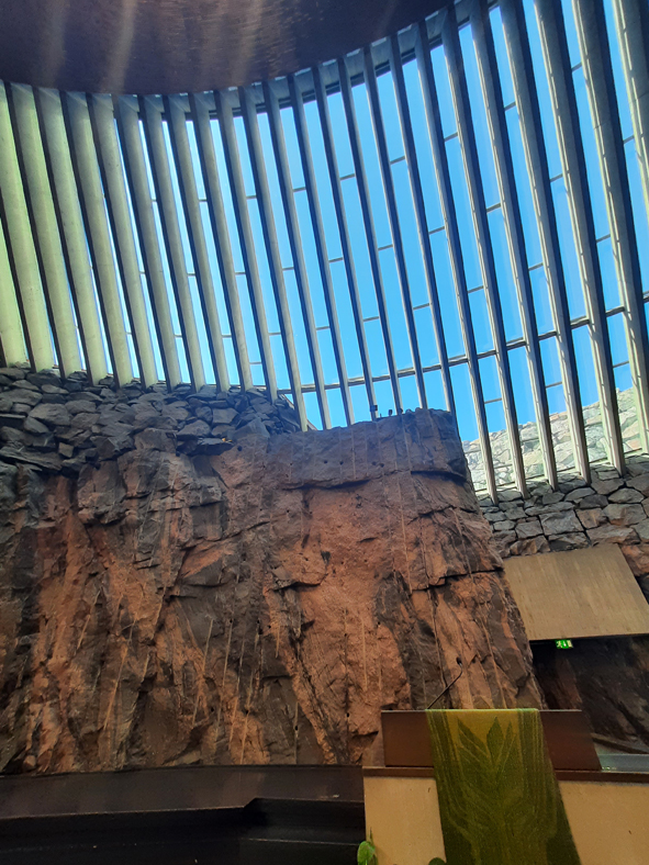 However, when we reached the Rock Church (Temppeliaukio Kirkko), it was closed – it wasn’t going to reopen for another 45 mins. Do we wait … do we skip … we decided to wait. There was a shop opposite the entrance to the church so we grabbed a drink (they also stocked flags and Christmas Baubles so managed to get these ticked off too) and sat in the shade until people started queuing.