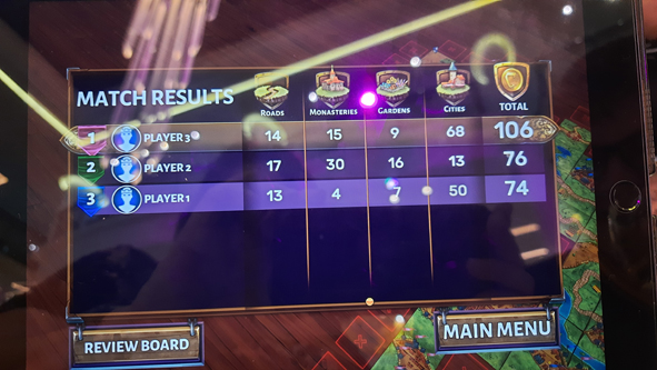 Back into our sea day routine – buffet for breakfast then down into the atrium for coffee/hot chocolate and a game of Carcassonne! Mum won again!!