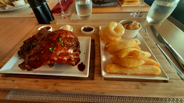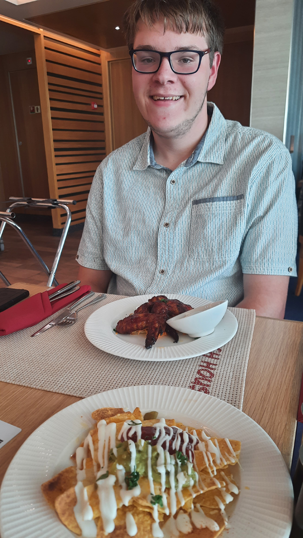 Final evening meal of the cruise and we managed to get a table in The Beach House. For starters, Callum had wings, Jon the prawns and I had the nachos. For mains, Callum went for the burger, Jon the steak on Lava stone and I had the BBQ ribs. Food was all very good.
