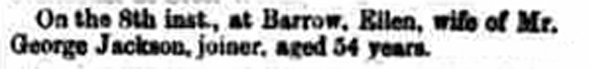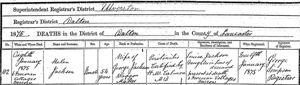 Her death was reported in Soulby’s Ulverston Advertiser and General Intelligencer on Thursday 14 January 1875 (Source: British Newspaper Archive).