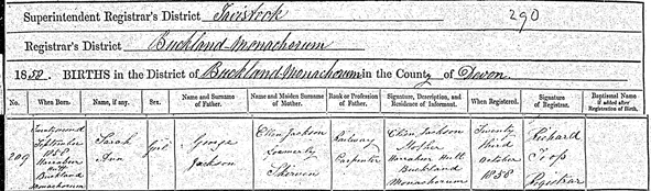 Sarah Ann JACKSON b. 22 September 1858 in Harrabeer Hutt/Heath, Buckland Monachorum, Devon.