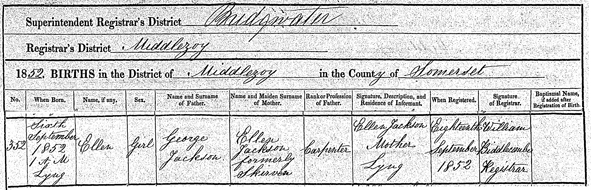Ellen JACKSON b. 6 September 1852 in Lyng, Somerset.