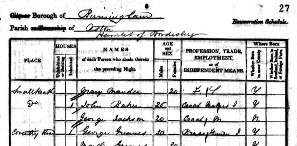 Source Citation Class: HO107; Piece: 1148; Book: 12; Civil Parish: Aston; County: Warwickshire; Enumeration District: 23; Folio: 27; Page: 8; Line: 3; GSU roll: 464183 Source Information Ancestry.com. 1841 England Census [database on-line]. Provo, UT, USA: Ancestry.com Operations, Inc, 2010. https://www.ancestry.co.uk/discoveryui-content/view/11059565:8978