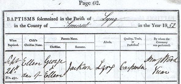 | Ellen JACKSON | Daur | Unm | 8 | Carpenter’s Daughter & Scholar | Lyng, Somerset |