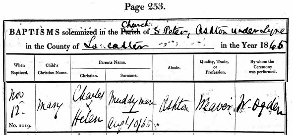 Charles and Ellen’s oldest child was born on 10 August 1865 and baptised at St Peters, Ashton-under-Lyne on 12th November 1865.