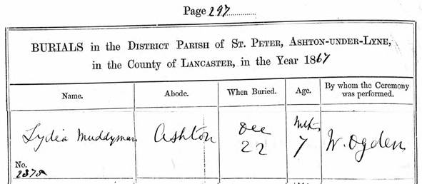 She was buried at St Peter, Ashton-under-Lyne on 22nd December 1867.