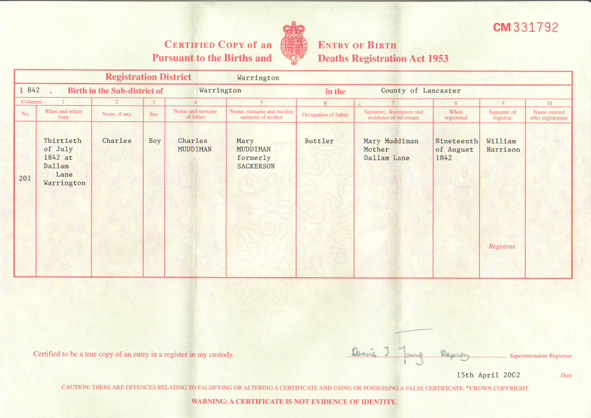 Charles Muddyman was born on 30th July 1842 at Dallam Lane in Warrington. He was the oldest child of Charles Muddiman and Mary Sackerson.
