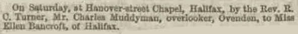 | Ellen MUDDIMAN | Wife | Mar | 27 | Cotton Weaver | Sowerby Bridge, Yorkshire |