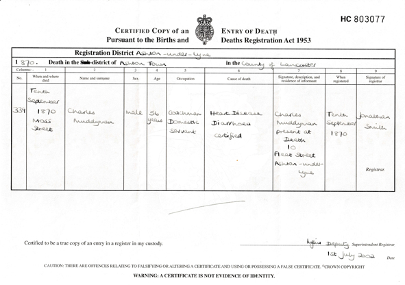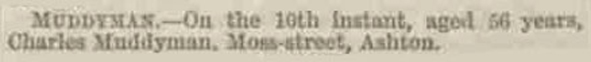 Charles Muddyman passed away on the 10th September 1870 at Moss Street in Ashton-under-Lyne, Lancashire.