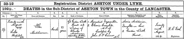 Ellen passed away aged 81 at Lake Hospital on 29th August 1924. Her daughter-in-law, Maria Muddiman, of 2 Garden Walk, Hurst, Ashton-under-Lyne registered her death. She was buried at St Michael and All Saints on 3rd September 1924. At the time of the 1921 Census, 2 Garden Walk was the home of Charles Alfred and Maria Muddiman; it looks as though Ellen lived with Charles and his family towards the end of her life.