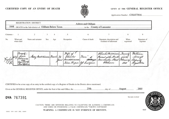 Charles’ mother passed away on 23rd February 1848 aged just 33 years at Manchester Street in Oldham. She was buried at St Mary’s Church in Oldham – the same church as her youngest son, William.