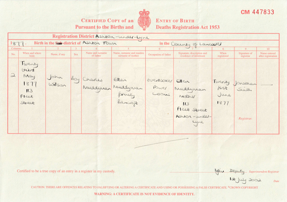 John Wilson Muddiman was born on 23rd May 1877 at 113 Fleet Street, Ashton-under-Lyne. His mother registered his birth.