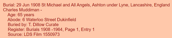 Charles Muddiman died at 6 Waterloo Street, Dukinfield towards the end of June 1908 aged 65. He was buried at St Michaels & All Saints on 29th June 1908.