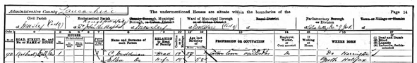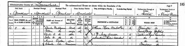 | Charles MUDDYMAN | Head | Mar | 38 | Cotton Power Loom Overlooker | Warrington, Lancashire |