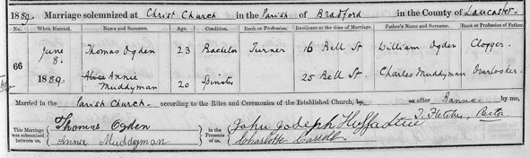 Annie Muddiman married Thomas Ogden at Bradford, Lancashire in 1889.