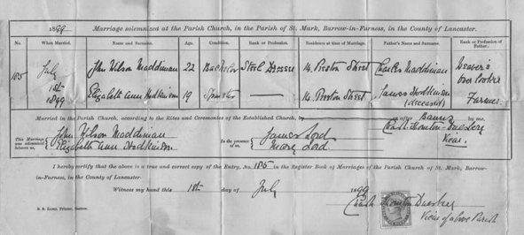 John Wilson Muddiman and Elizabeth Ann Hodkinson married at St Marks Church, Barrow-in-Furness on 1st July 1899.