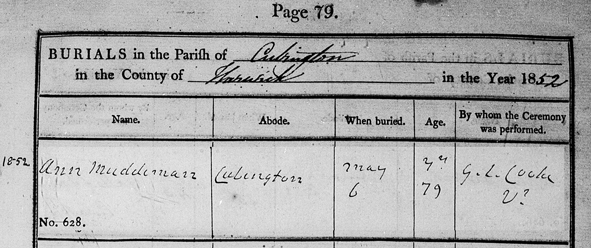 Ann Muddiman died in May 1852 aged 79 years of age and was buried at Cubbington Parish Church on 6th May 1852.