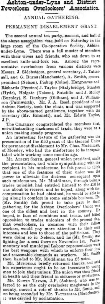 At the Ashton-under-Lyne Powerloom Overlookers Association Gathering on Saturday 11th October 1902, Charles was awarded a £50 grant from the General Union as a result. The accident happened a few months prior.