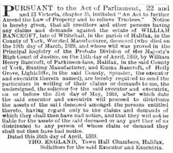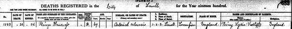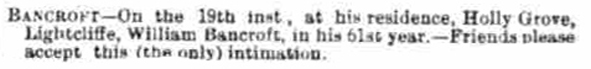George died on 23rd October 1900 from Arterial Sclerosis. He gave his occupation as a Loomfixer. WIth the change in occupation, from Merchant/Tea Dealer, it’s possible that it’s two different George Bancrofts but with weaving in the family, it may be a profession he fell back on.