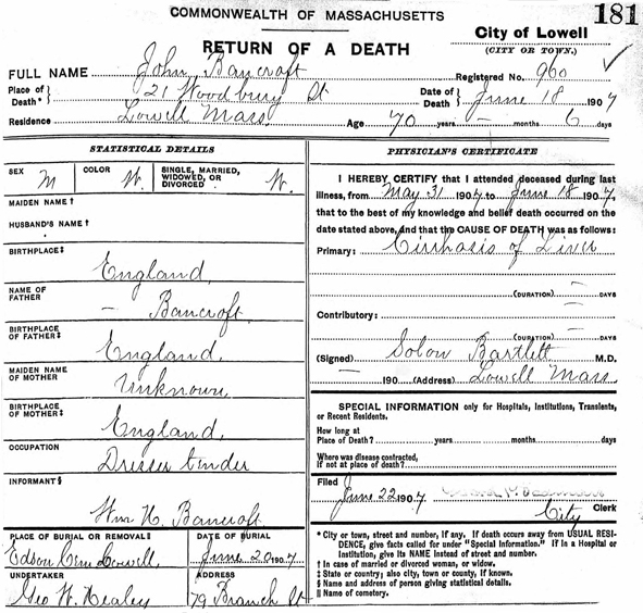 My gt-grandmotherx2, Ellen Bancroft, was barely 1 year old when Lydia died of Typhus Fever.