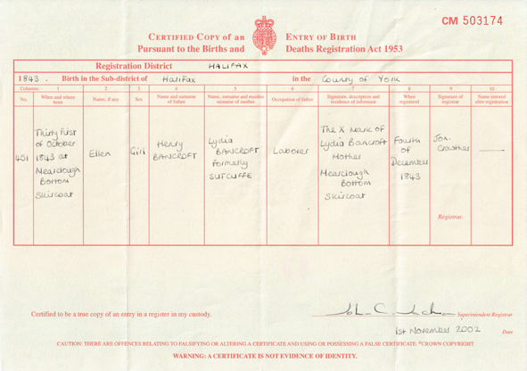 Ellen Bancroft was born on 31st October 1843 at Mearclough Bottom, Skircoat (just south of Halifax) – the youngest daughter of Henry Bancroft and Lydia nee Sutcliffe.
