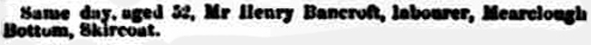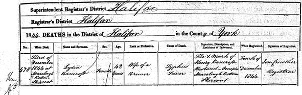Lydia died Mearclough Bottom, Skircoat on 3rd December 1844 aged 42 years of age (although this age may not be strictly correct).