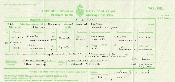 Ellen married Charles Muddiman on 20th August 1864 at Hanover Street Chapel in Halifax. She was living in the Kings Cross area at the time.