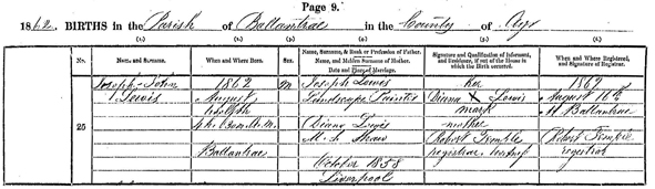 John William Lewis appears to have been born as Joseph John Lewis was born on 12th (or 16th!) August 1862 in Ballantrae, Scotland. His parents are stated as Joseph Lewis – a Landscape Painter.