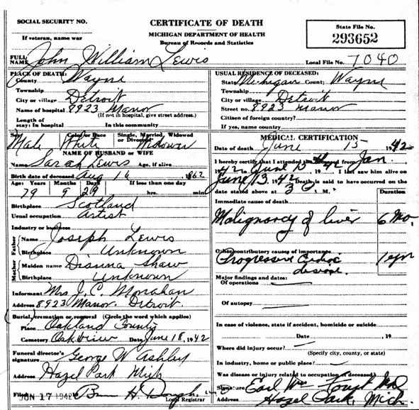 John William Lewis died in Wayne County, Detroit on 15th June 1942. Cause of death was reported as Malignicy of Liver (6 months).