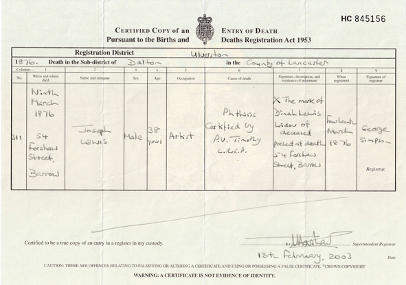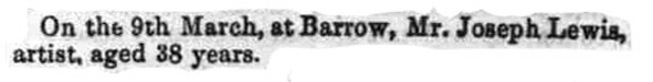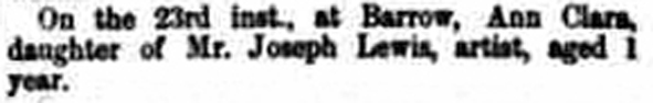 Joseph Lewis died from Phthisis (Pulmonary Tuberculosis) at 54 Forshaw Street, Barrow-in-Furness on 9th March 1876 and was buried two days later at Barrow Cemetery. On his death certificate, his occupation was described as Artist but we have not been able to find any reference to him or any of his work.