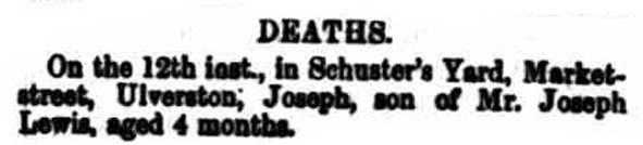 Sadly he died aged just 4 months in Schuster’s Yard, Market Place in Ulverston.