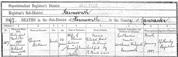 In 1891, they were living at 2 Simpson Street in Bolton. Eagle Diana died from Mania Dilated Heart Asthenia on 31st December 1896 at the Workhouse at Fishpool in Farnworth (Bolton) and was buried at St James The Apostle, New Bury, Lancashire on 5th January 1897.