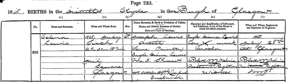 Celena Lewis was born in Jail Square, Glasgow on 6th July 1868. Her birth record shows her parents names and also when they were married.
