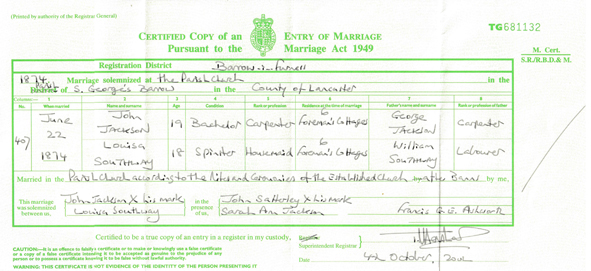 She married John Jackson on 22nd June 1874 at St George, Barrow in Furness. Witnesses were John’s sister, Sarah Ann Jackson, and John Satterley (who married Louisa’s older sister, Anna Maria).