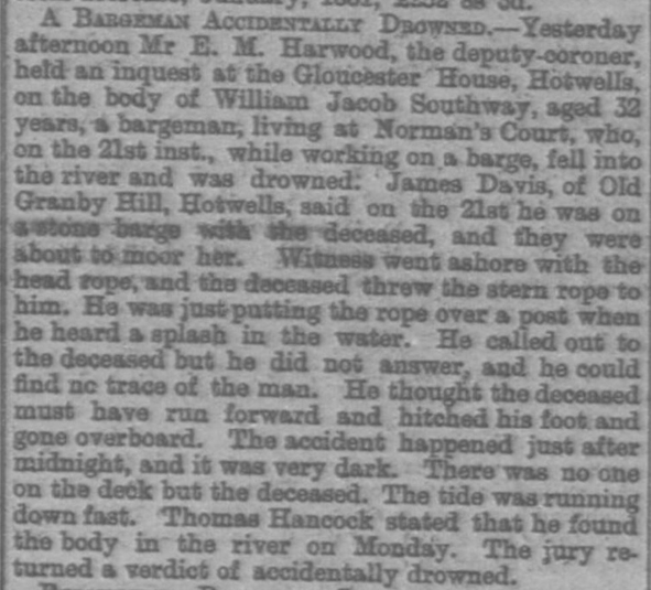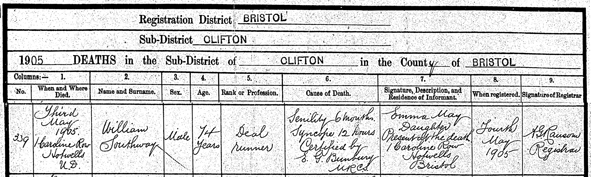 William Southway died on 3rd May 1905 aged 74 at 1 Caroline Row, Hotwells in Clifton. His daughter, Emma Jemima May, registered his death.